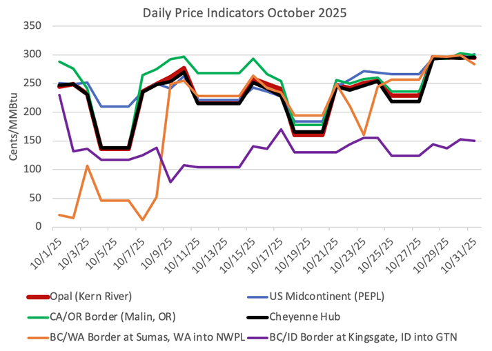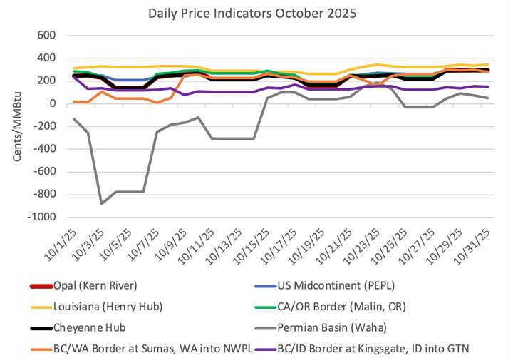 The charts below depict the daily cash price for natural gas at Opal and at the Cheyenne Hub for each day in October 2025. Also shown are prices at some key locations downstream from Wyoming going to the west and going to the midcontinent region and the price for Waha, TX which represents the Permian Basin. Canadian supplies from Alberta (through Kingsgate, ID, the purple line on the first chart) and from British Columbia (through Sumas, WA, the orange line on the first chart) remain low in comparison to prices in SW Wyoming.