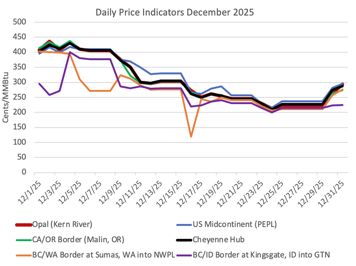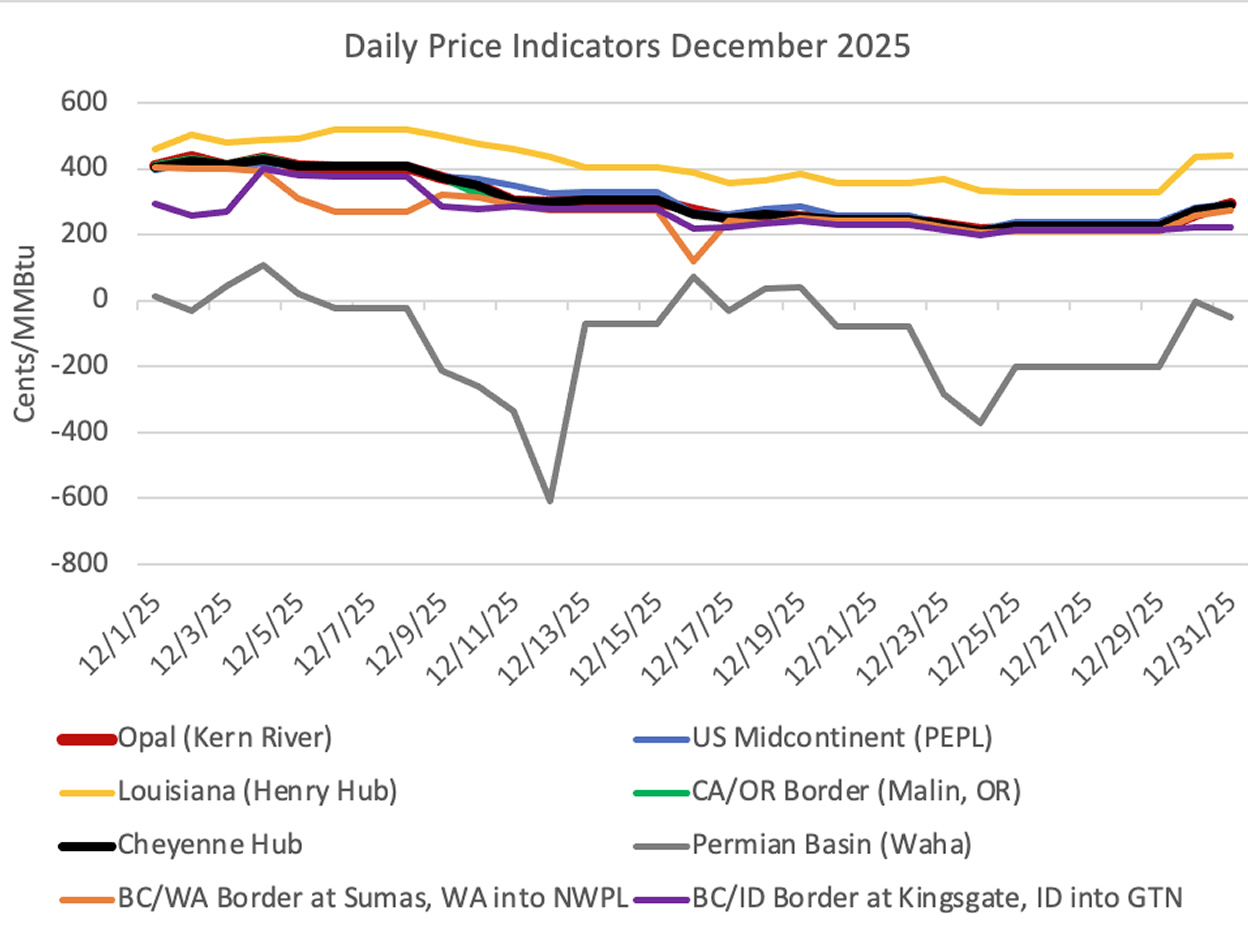 The charts below depict the daily cash price for natural gas at Opal and at the Cheyenne Hub for each day in December 2025. Also shown are prices at some key locations downstream from Wyoming going to the west and going to the midcontinent region and the price for Waha, TX which represents the Permian Basin. Canadian supplies from Alberta (through Kingsgate, ID, the purple line on the first chart) and from British Columbia (through Sumas, WA, the orange line on the first chart) remained low in comparison to prices in SW Wyoming.