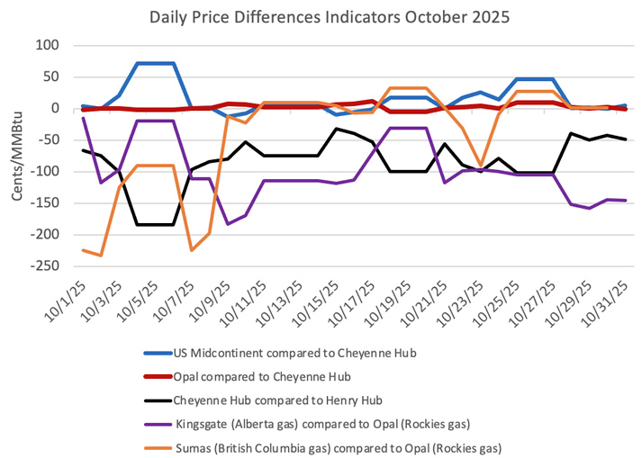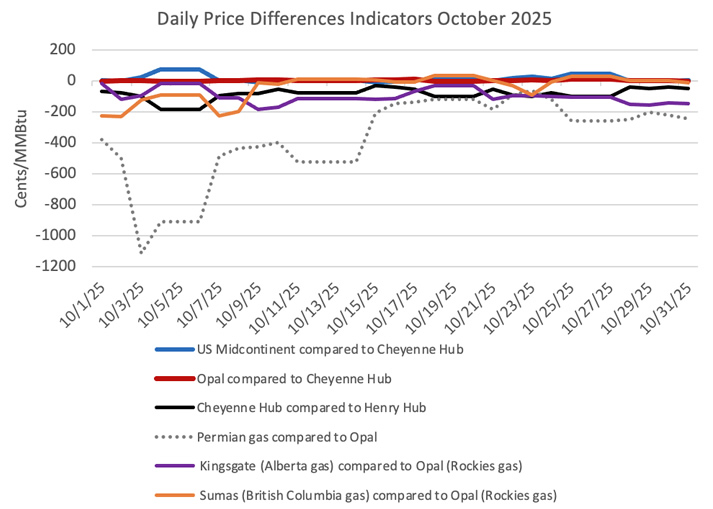 The second chart includes lines for the difference between Opal (Rockies gas) and Sumas (British Columbia gas) and for the difference between Opal and Kingsgate (Alberta gas) and for the difference between Opal and the Permian Basin. A negative value in the orange, purple and dashed grey lines depicts the extent to which British Columbia gas, Alberta gas and Permian gas respectively, were cheaper than Rockies gas in the daily market during October 2025.