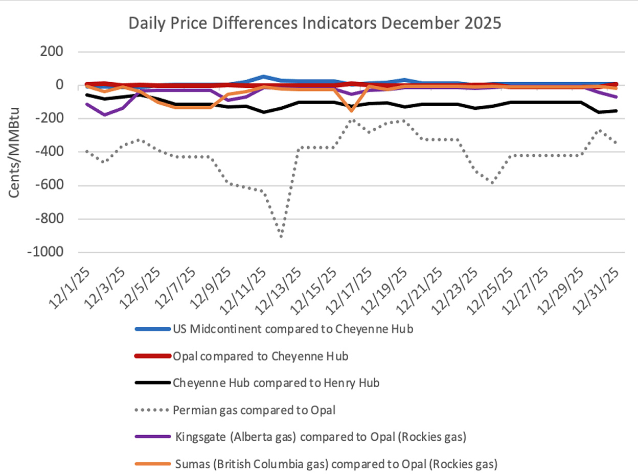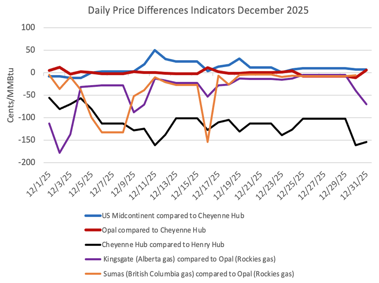 The second chart includes lines for the difference between Opal (Rockies gas) and Sumas (British Columbia gas) and for the difference between Opal and Kingsgate (Alberta gas) and for the difference between Opal and the Permian Basin. A negative value in the orange, purple and dashed grey lines depicts the extent to which British Columbia gas, Alberta gas and Permian gas respectively were cheaper than Rockies gas in the daily market during December 2025.
